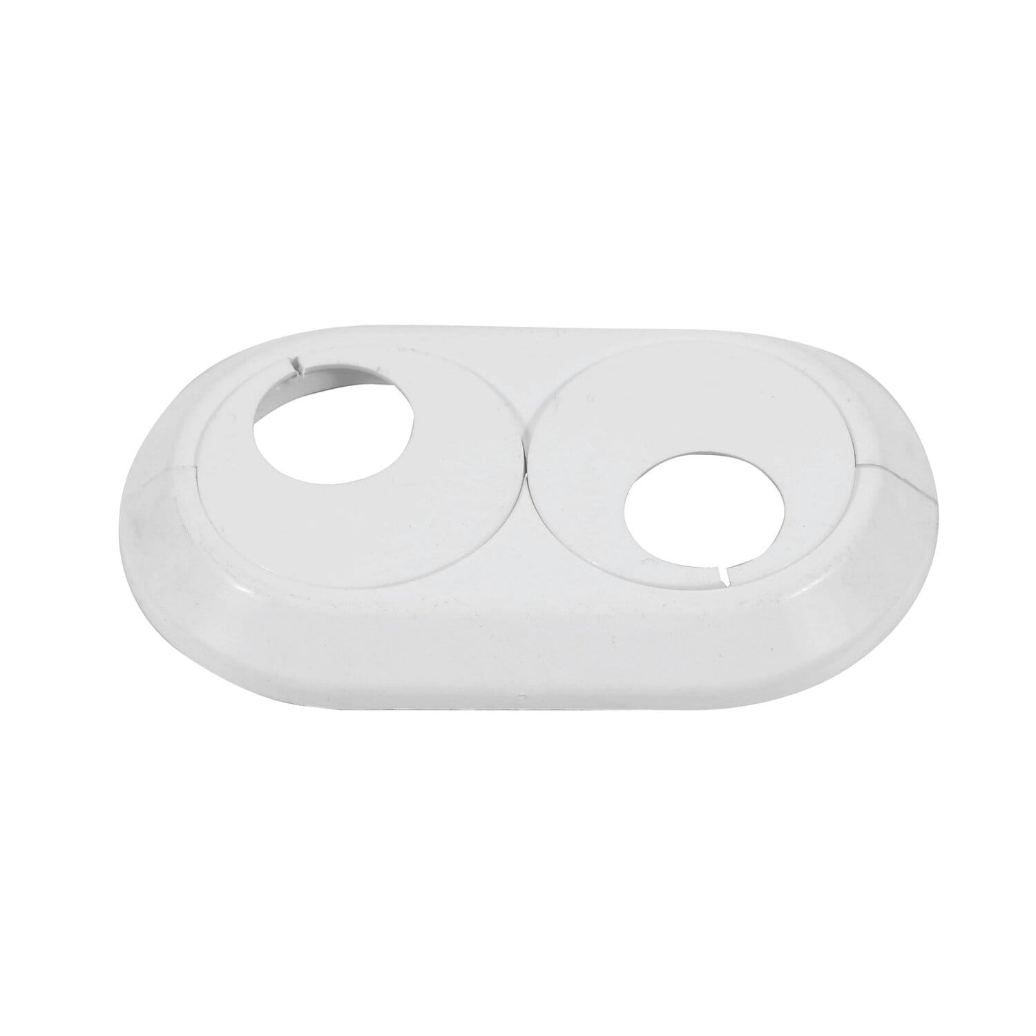 Rozeta podwójna, biała o średnicy 15 mm firmy Tycner. Przeznaczona jest do maskowania otworów w instalacji z rur miedzianych.