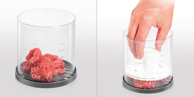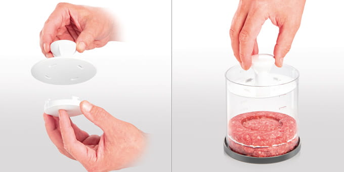 - Miarki: Z miarkami do łatwego przygotowywania niższych i wyższych hamburgerów o masie 100 lub 150 g w stanie surowym.