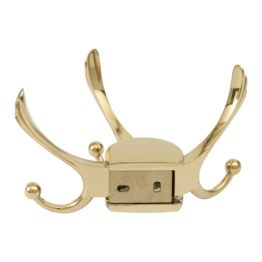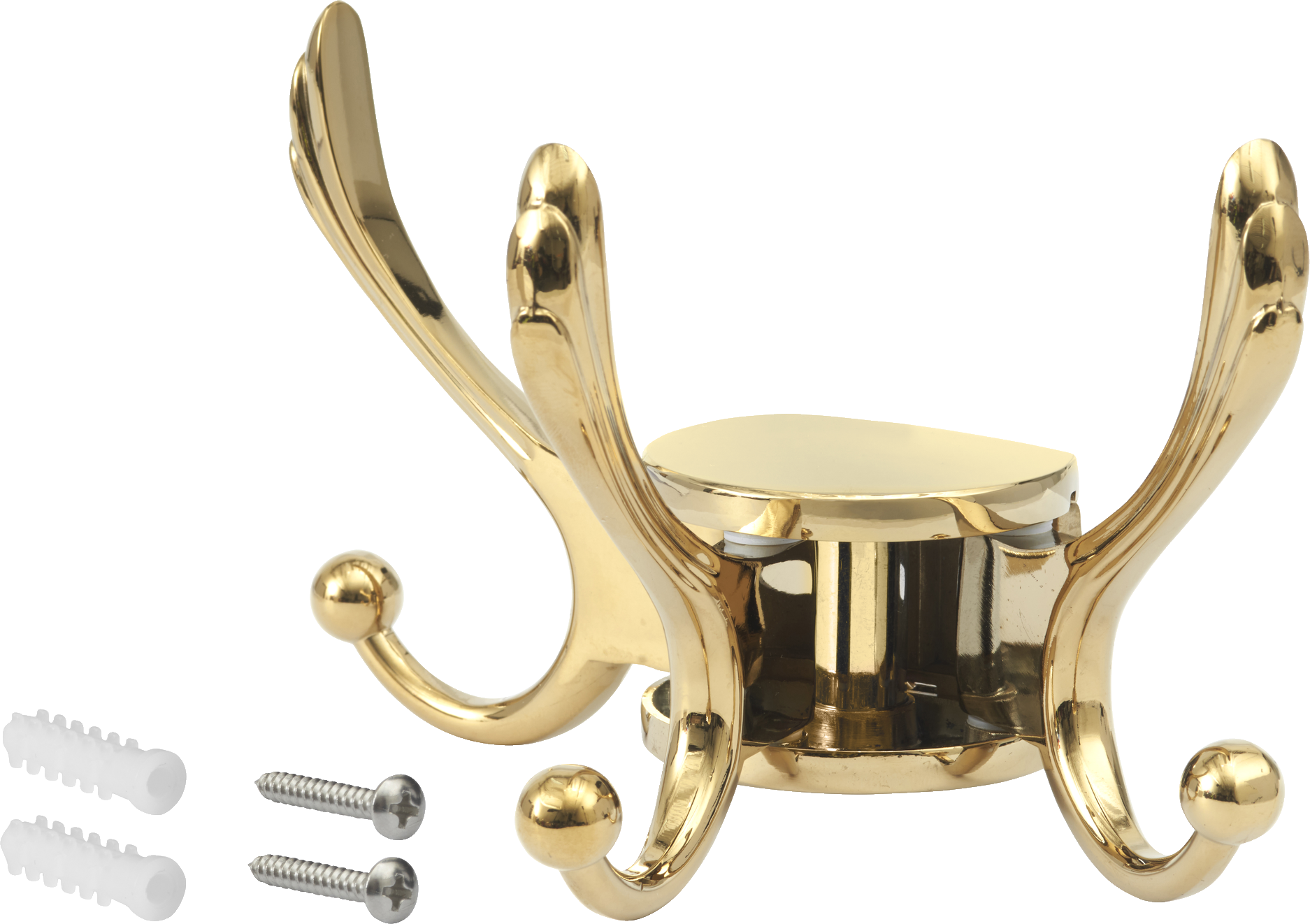 Złote mocowanie obrotowe z łącznie trzema haczykami – idealne dla osób, które szukają produktu umożliwiającego wieszanie w przedpokoju, kuchni lub sypialni przy jednoczesnej oszczędności miejsca. Produkt wykonany ze stopu cynkowego.