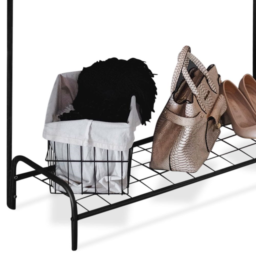 Wieszak podłogowy na ubrania. Idealnie sprawdzi się w domu, biurze, poczekalni oraz garderobie. Wyposażony w półkę na buty lub akcesoria. Wykonany z metalu oraz płyty MDF.✅Dane techniczne: