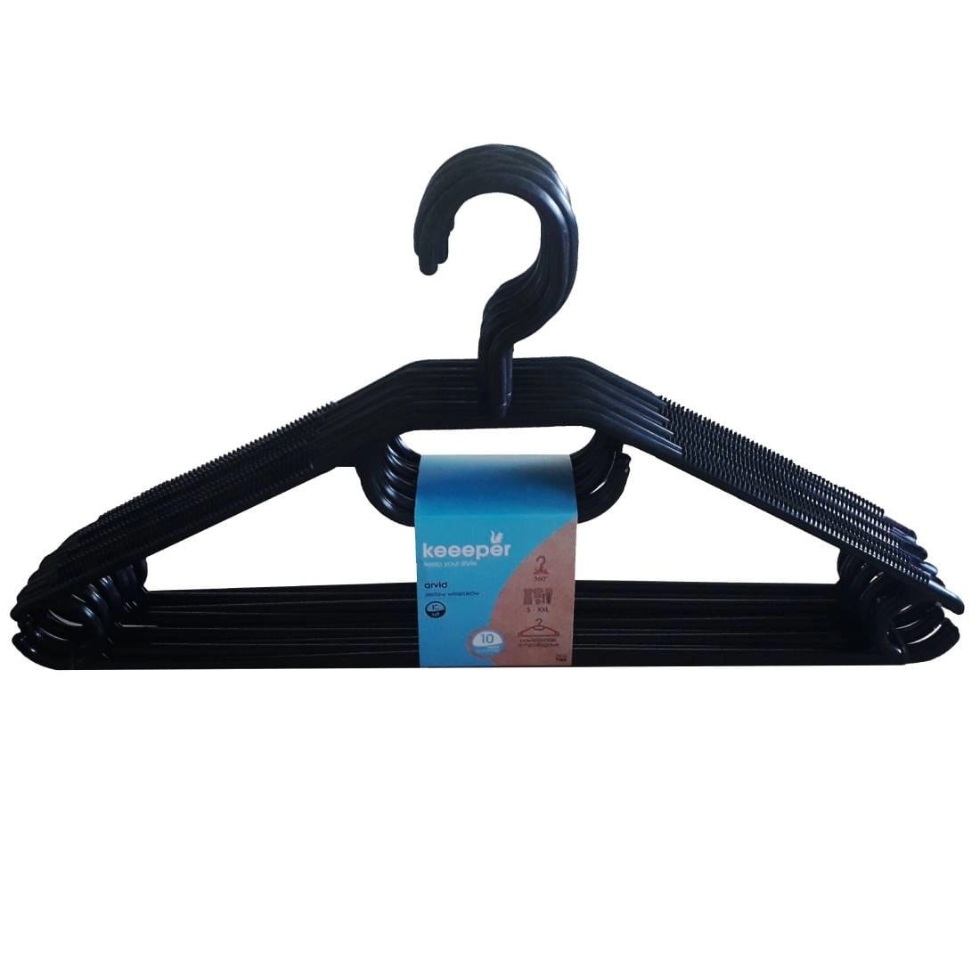 Zestaw 10 plastikowych wieszaków marki KeeperUniwersalne czarne wieszaki doskonale sprawdzą się przy przechowywaniu wszelkich elementów garderoby - dzięki praktycznej poprzeczce wygodnie i równo przewiesisz spodne, wieszaki posiadaja również ucho na krawat.