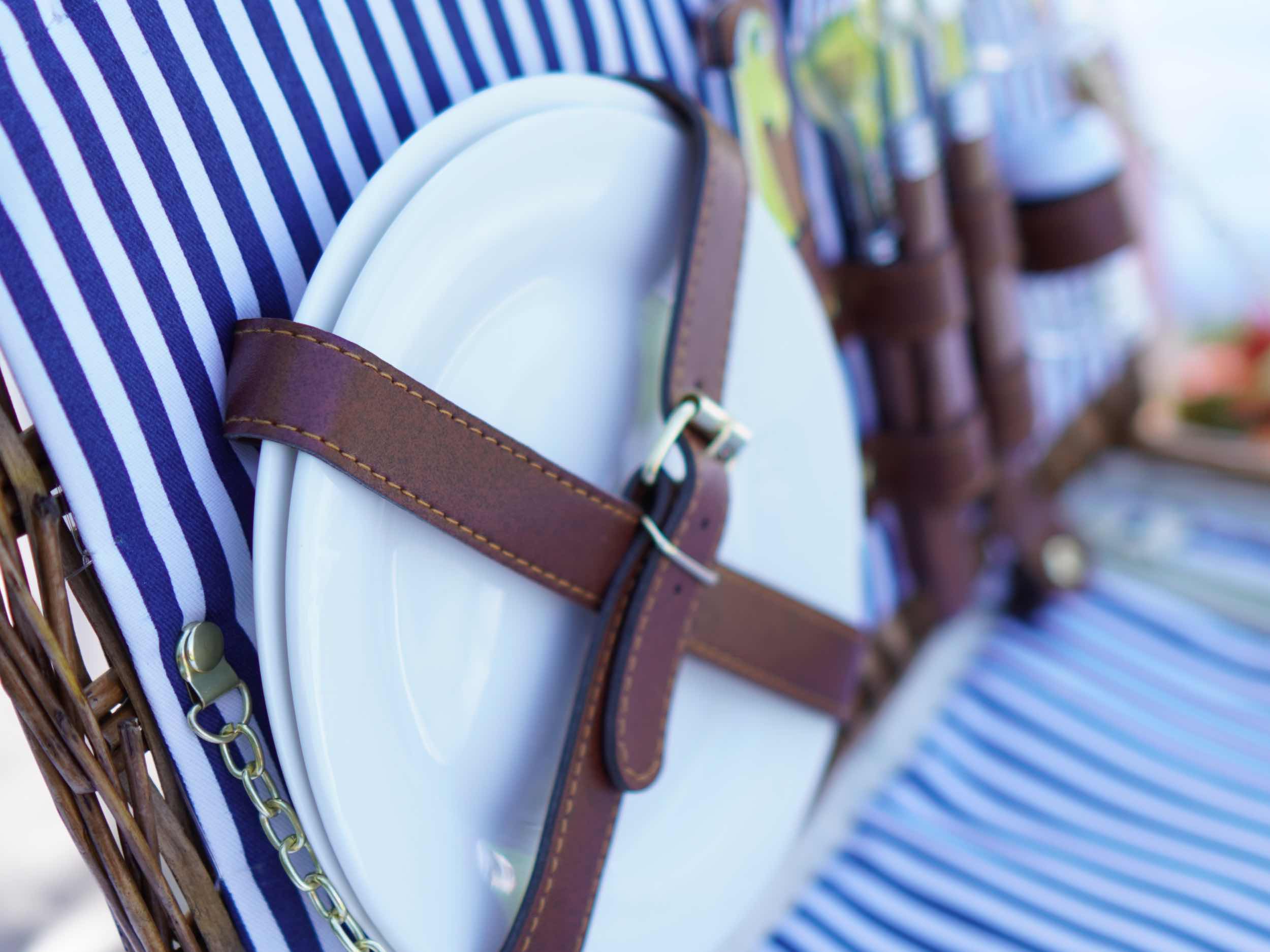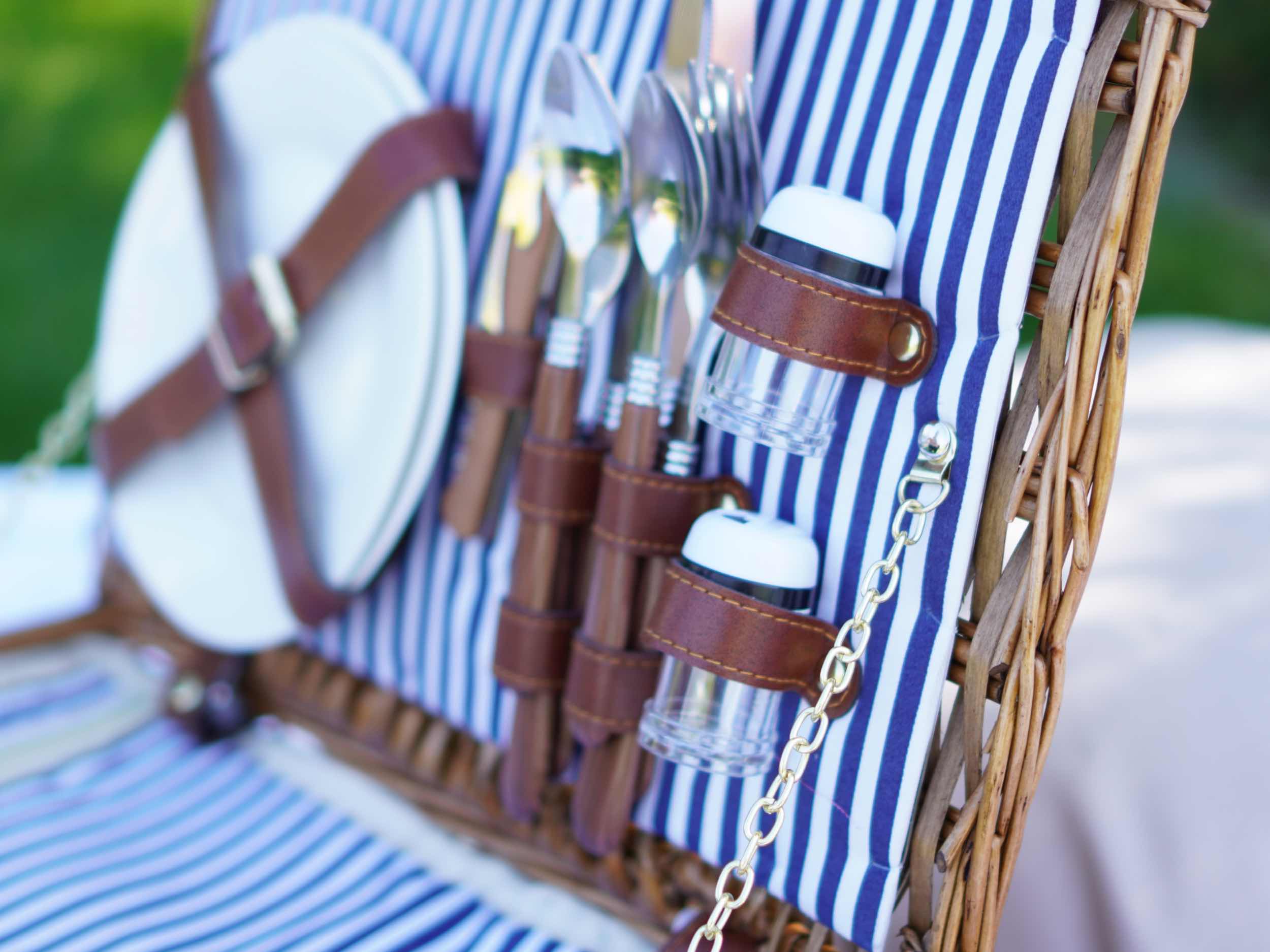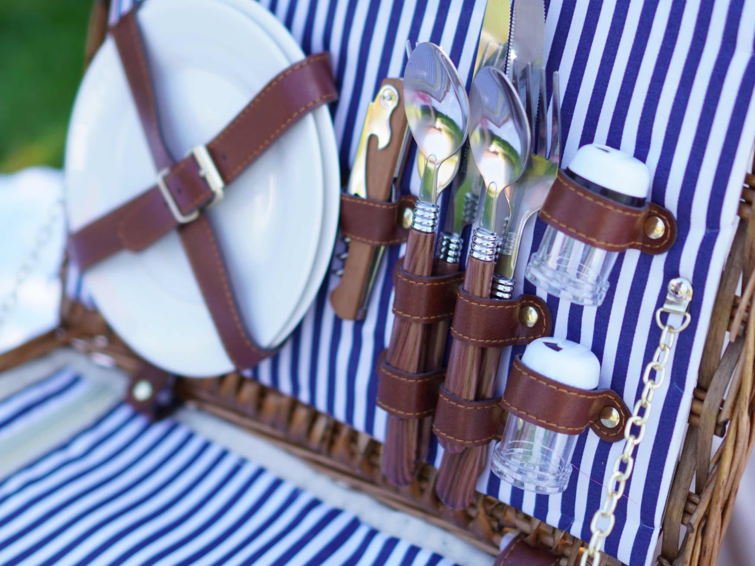 W komplecie znajdziesz eleganckie talerze i sztućce dla dwóch osób, które doskonale komponują się z estetyką koszyka.