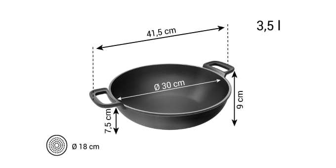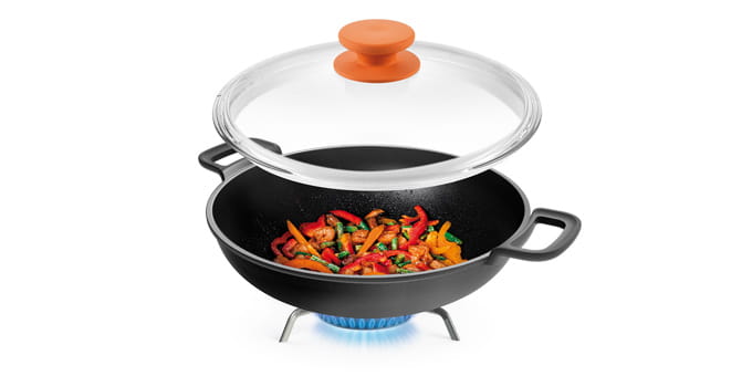 Masywny żeliwny wok o wysokiej akumulacji ciepła doskonały do grillowania mięsa, ryb i warzyw na kuchenkach gazowych, na grillach oraz w piekarniku.