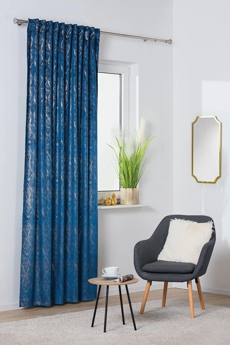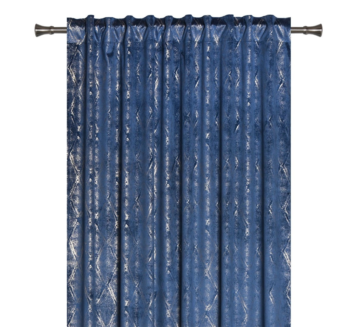 Zasłona doskonale będzie pełnić jednocześnie funkcję użytkową, zasłaniając okna i przyciemniając pomieszczenie kiedy sobie tego zażyczysz, ale również ozdobną dzięki swojej pięknej kolorystyce podkreślonej geometrycznymi wzorami w stylu glamour.