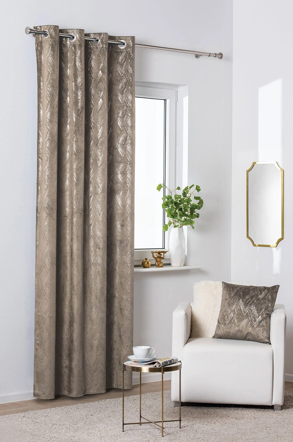 Drukowany welwet ze złotymi geometrycznymi przetarciami sprawia, że zasłony z serii Dubai charakteryzują się wyjątkową elegancją i zapewnią szykowne wykończenie każdej przestrzeni. Efektowny materiał i zachwycający wzór łączą się z uniwersalną, klasyczną kolorystyką, przez co zasłony Dubai sprawdzą się w różnorodnych aranżacjach wnętrz. Przyciemniająca zasłona nie tylko pozwoli regulować dopływ światła do pomieszczenia w zależności od pory dnia, ale także ochroni domowników przed wścibskimi spojrzeniami z zewnątrz. Zawieszenie na kółkach jest bardzo wygodnym rozwiązaniem, pozwalającym na szybkie wieszanie oraz zdejmowanie zasłony, a także na płynne przesuwanie jej na karniszu.