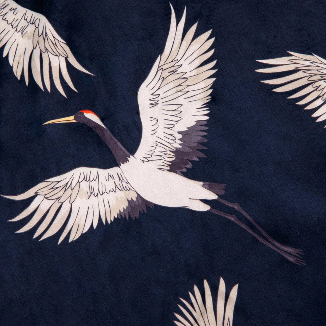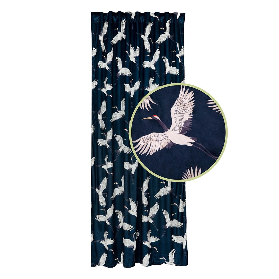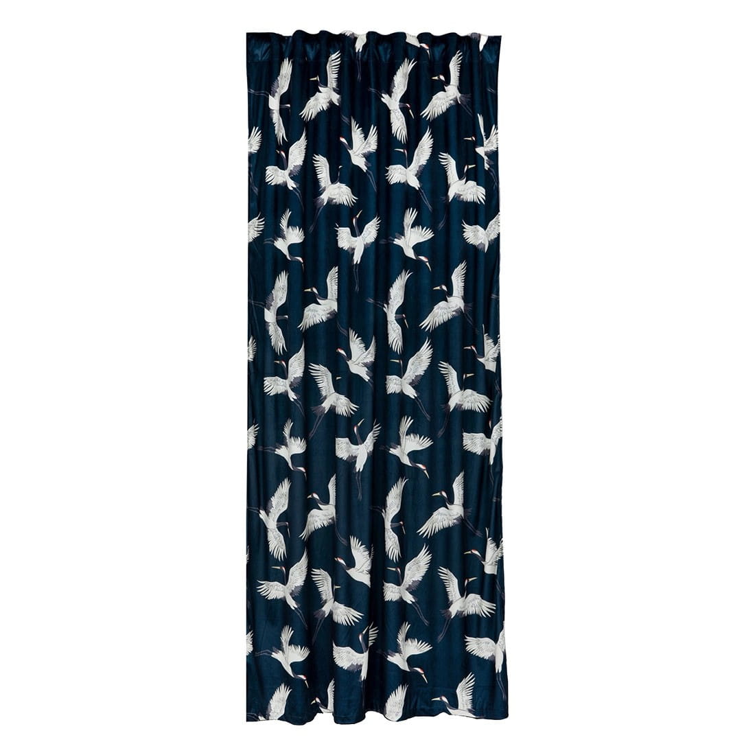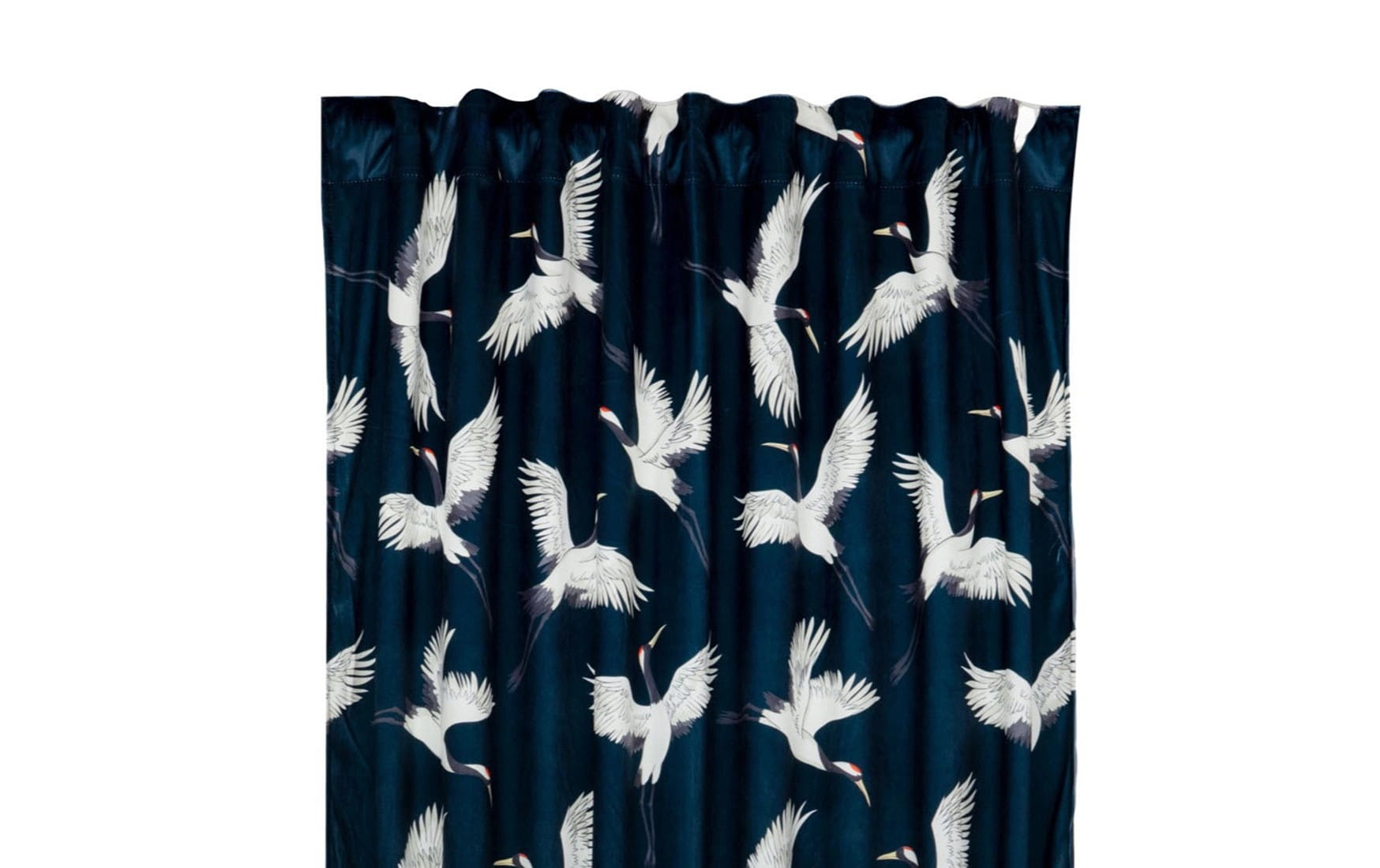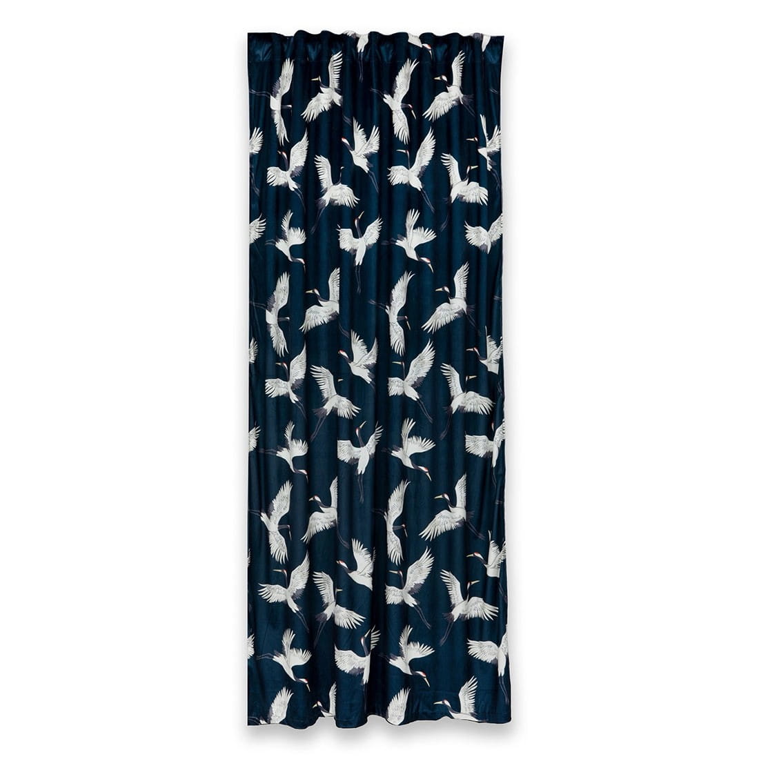 Zasłona welwetowa na taśmie we wzór żurawi. Dzięki taśmie z tunelem zasłona nadaje się do zawieszenia na karnisz oraz szynę. Wyjątkowo wygodna w użytkowaniu poprzez łatwe przesuwanie na rurce karnisza. Zasłona stanowi stylowy i elegancki element wykończeniowy każdego okna, jednocześnie podkreślając charakter: salonu, sypialni, gabinetu czy innego pomieszczenia. Sprawdza się jako pojedyncza ozdoba okna, jak również jako baza bogatszej kompozycji.