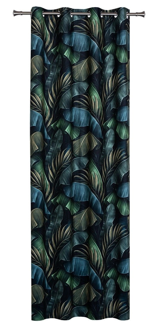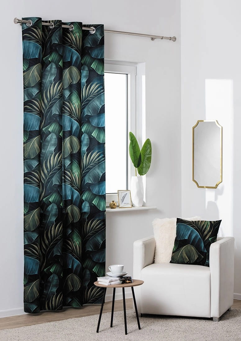 Ciemna, elegancka kolorystyka w połączeniu z inspiowanym naturą wzorem dużych, zielonych liści wprowadzi wyjątkowe poczucie komfortu i szyku do Twojego mieszkania. Sprawdzi się jako samodzielna ozdoba okna lub element bogatszej kompozycji.