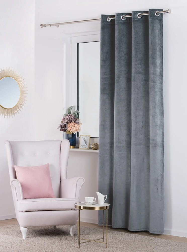 Zasłona VELVET szara 140 x 260 cm na przelotkachGładka, półzaciemniająca zasłona zakończona kółkami ułatwiającymi szybkie zawieszanie w oknie. Wyjątkowo wygodna w użytkowaniu poprzez łatwe przesuwanie na rurce karnisza. Zasłona stanowi stylowy i elegancki element wykończeniowy każdego okna, jednocześnie podkreślając charakter salonu, sypialni, gabinetu czy innego pomieszczenia. Sprawdza się jako pojedyncza ozdoba okna, jak również jako baza bogatszej kompozycji. Piękne kolory ożywią niejedno pomieszczenie.