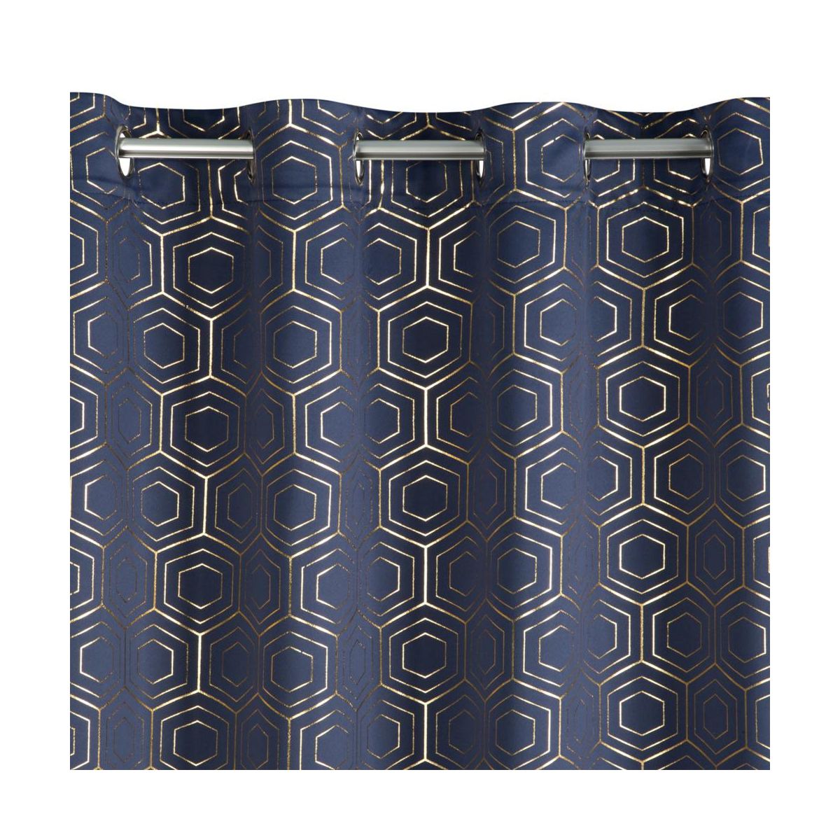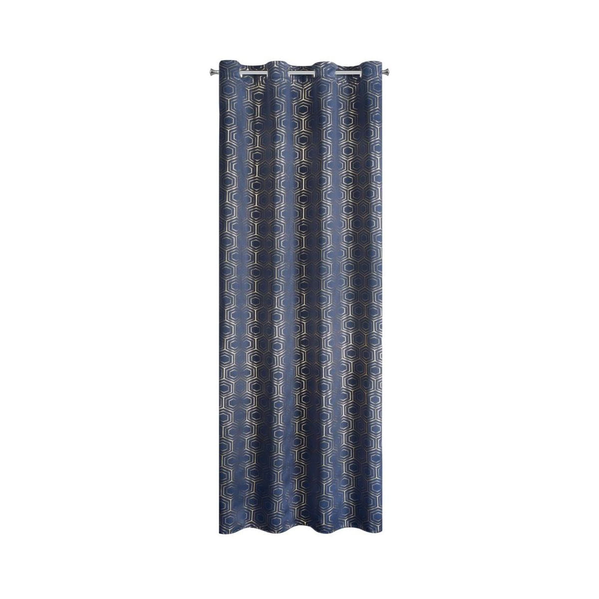 Zasłona zaciemniająca ze złotym, geometrycznym nadrukiem. Praktyczne przelotki zamocowane w górnej części zasłony gwarantuje szybką zmianę dekoracji okiennej.