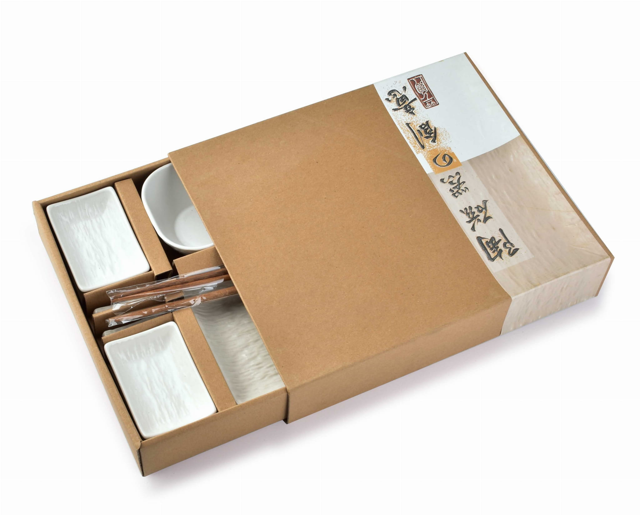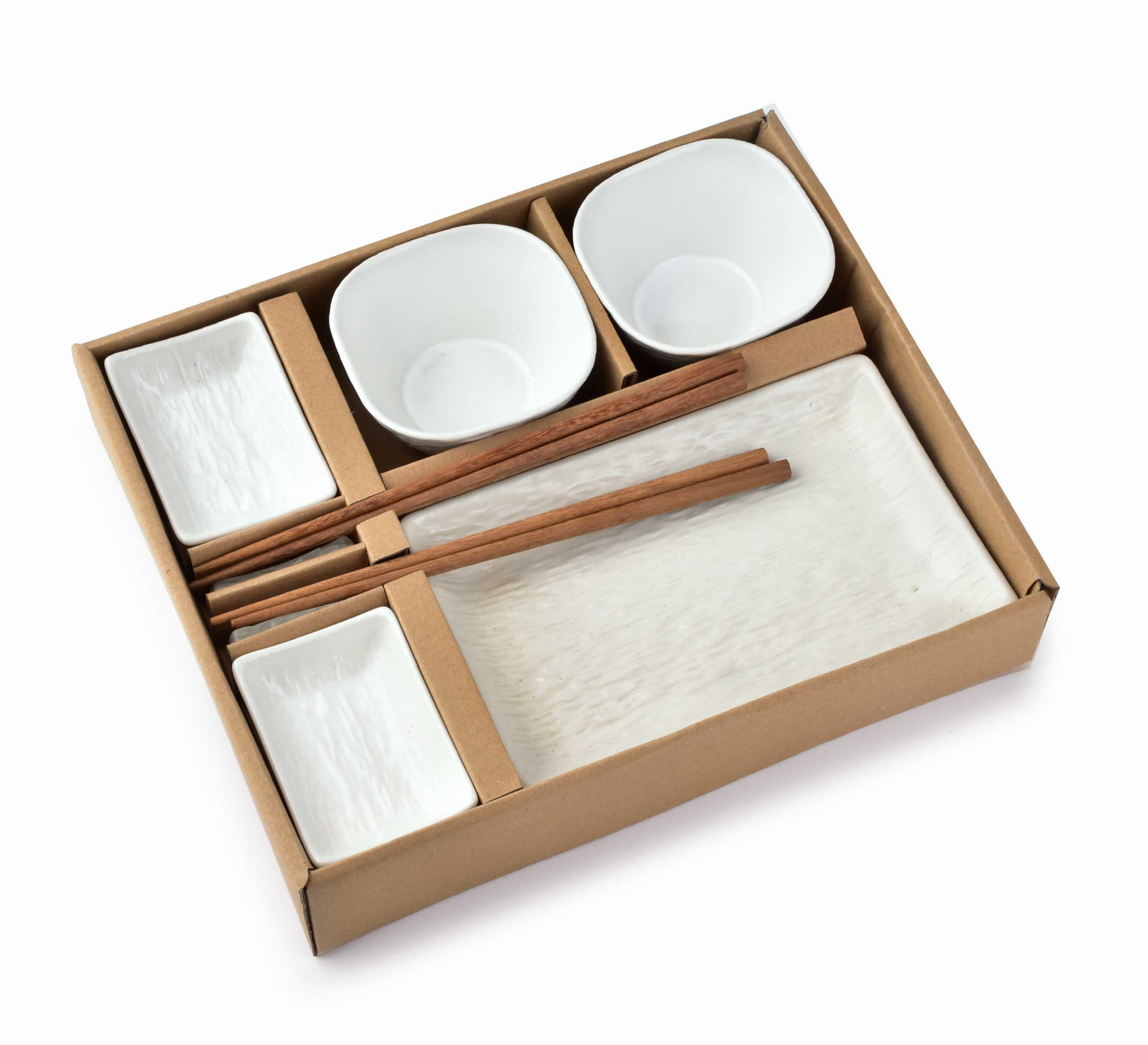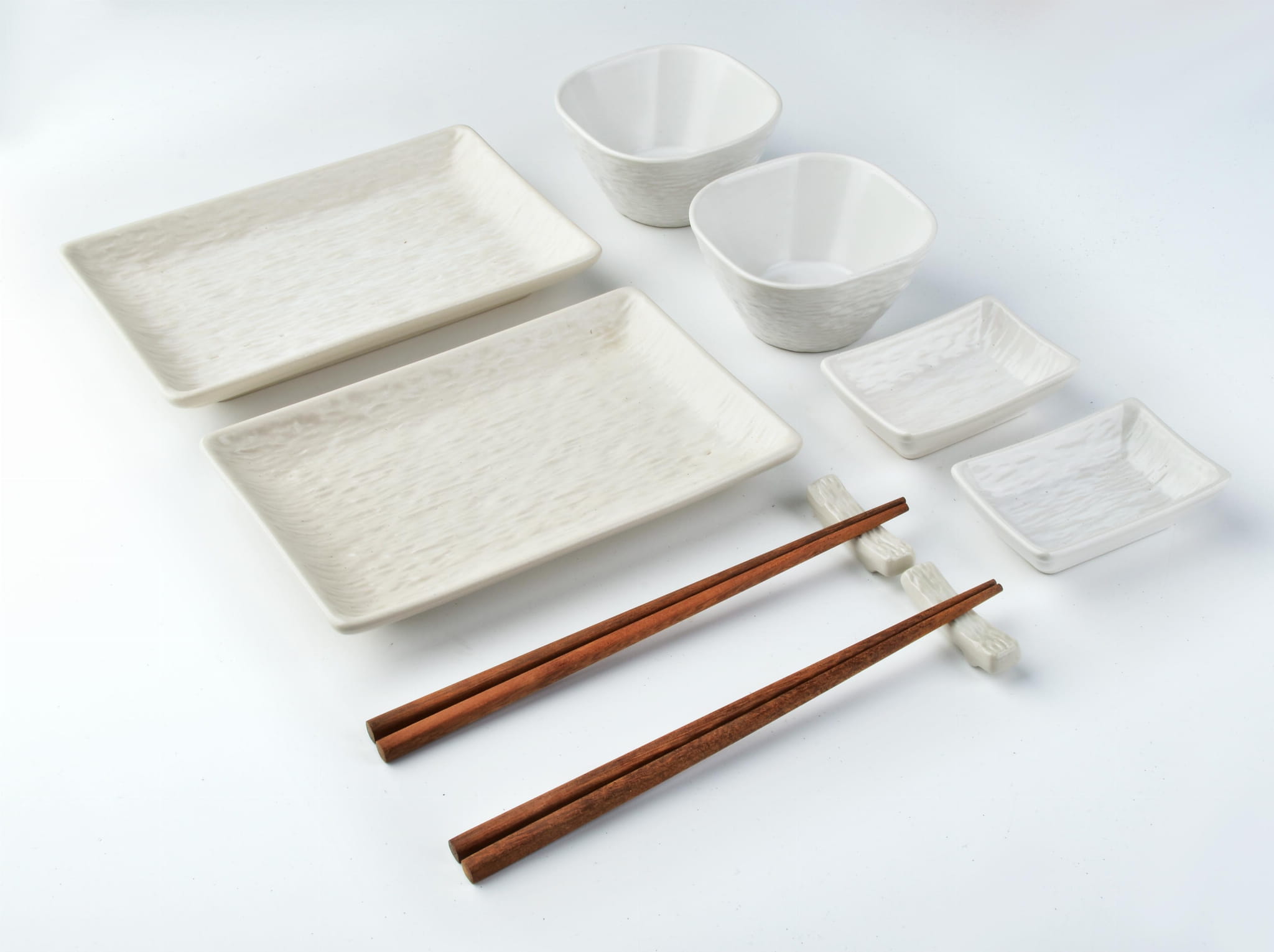 Porcelanowy zestaw do sushi składający się z 10 elementów. Naczynka są zdobione tłoczeniem w kolorze czarnym imitującym kamień. Zestaw dla 2 osób. Zawiera 2 zestawy pałeczek, podstawki pod pałeczki, 2 miseczki na sos, 2 miseczki oraz 2 prostokątne talerzyki.