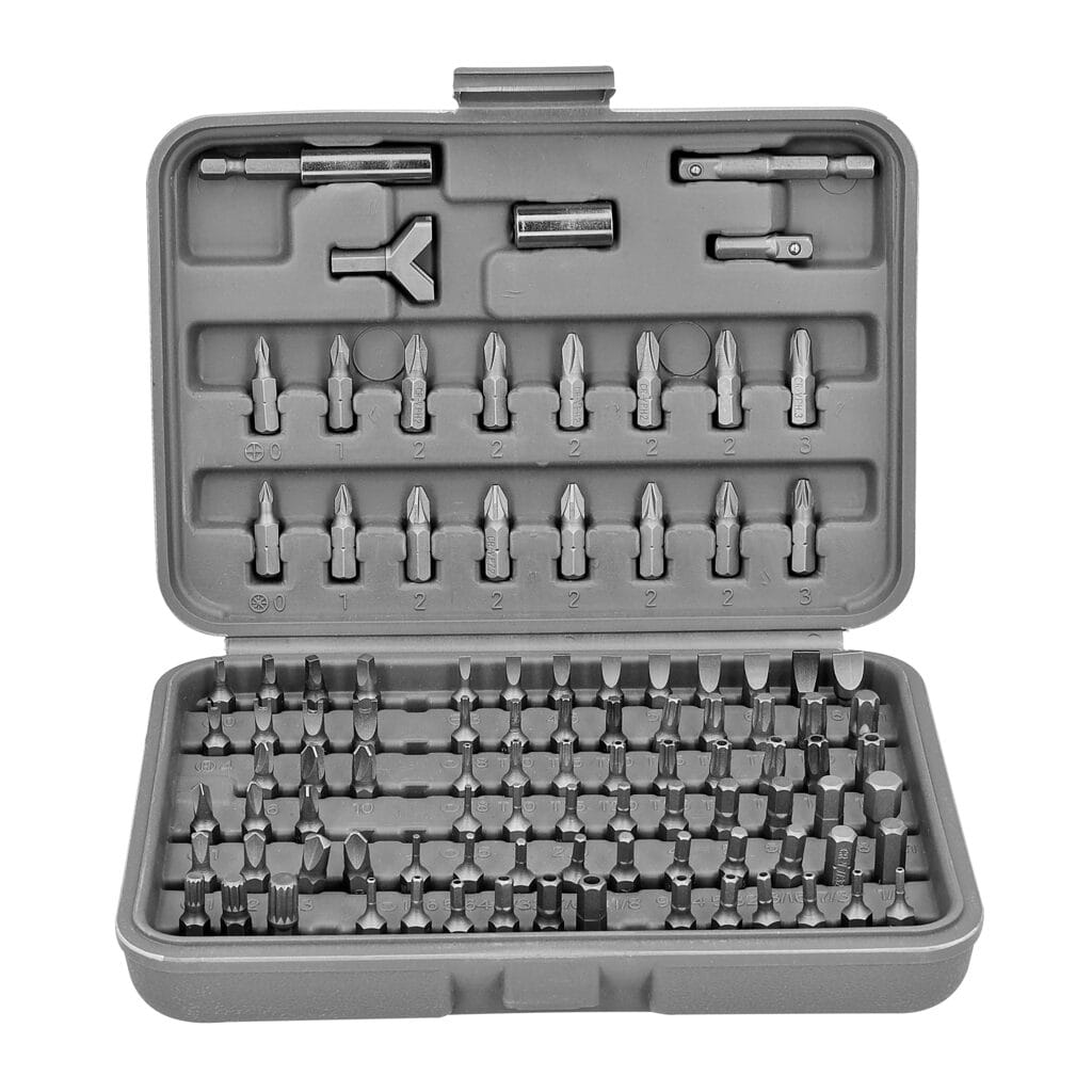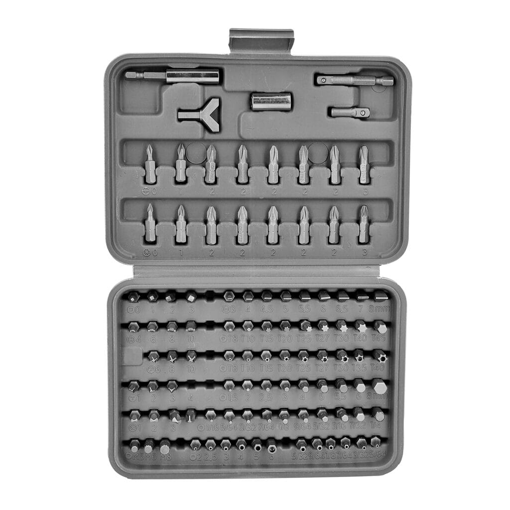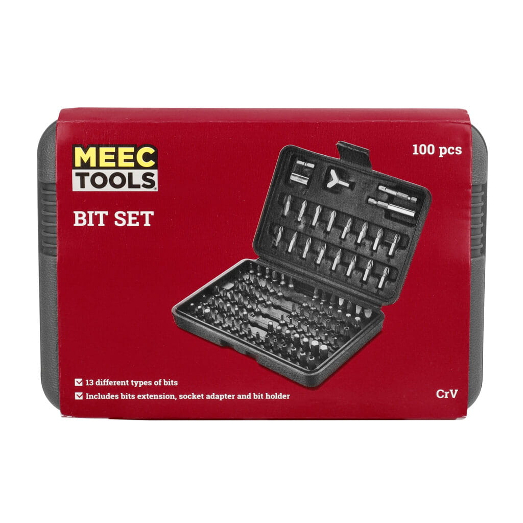 100-elementowy zestaw marki Meec Tools zawiera prawie wszystkie końcówki, których możesz potrzebować! Od zwykłych końcówek do wkrętarki po nietypowe końcówki specjalne do trudnych wkrętów. Zestaw zawiera 13 różnych rodzajów końcówek w wielu rozmiarach oraz uchwyt, przedłużkę i przejściówkę do nasadek.