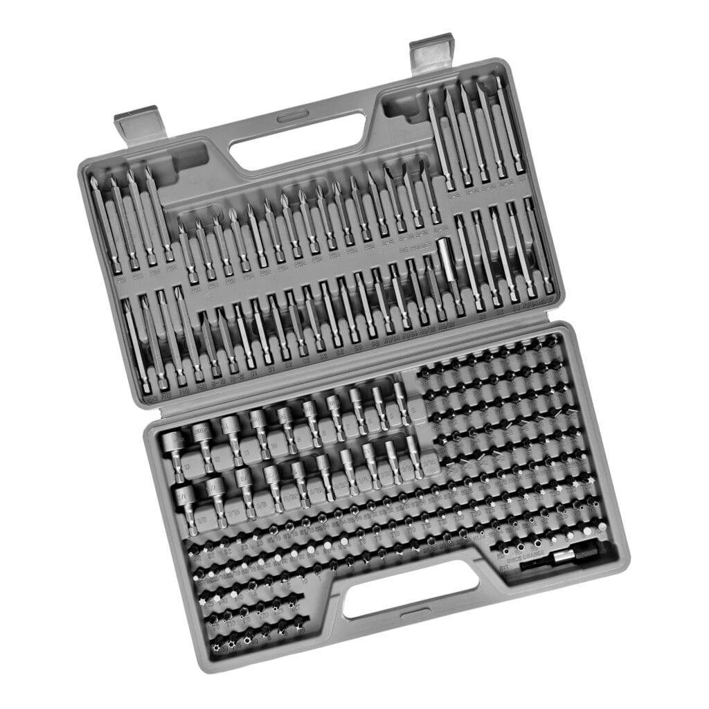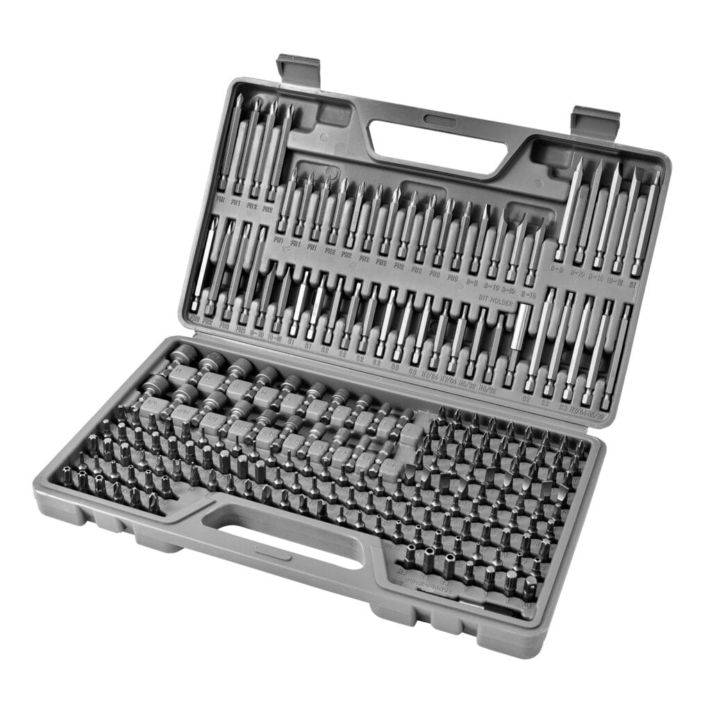 Zestaw końcówek do intensywnego, częstego użytku! Zestaw końcówek 208-częściowy marki Meec Tools zawiera końcówki w trzech różnych długościach 25, 50 i 75 mm. Oczywiście obejmuje najpopularniejsze końcówki do wkrętarki o różnych rozmiarach, a także komplet końcówek specjalnych do wszystkich trudnych wkrętów. Poza tym w komplecie otrzymujesz uchwyty na końcówki i nasadki.