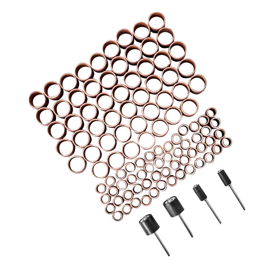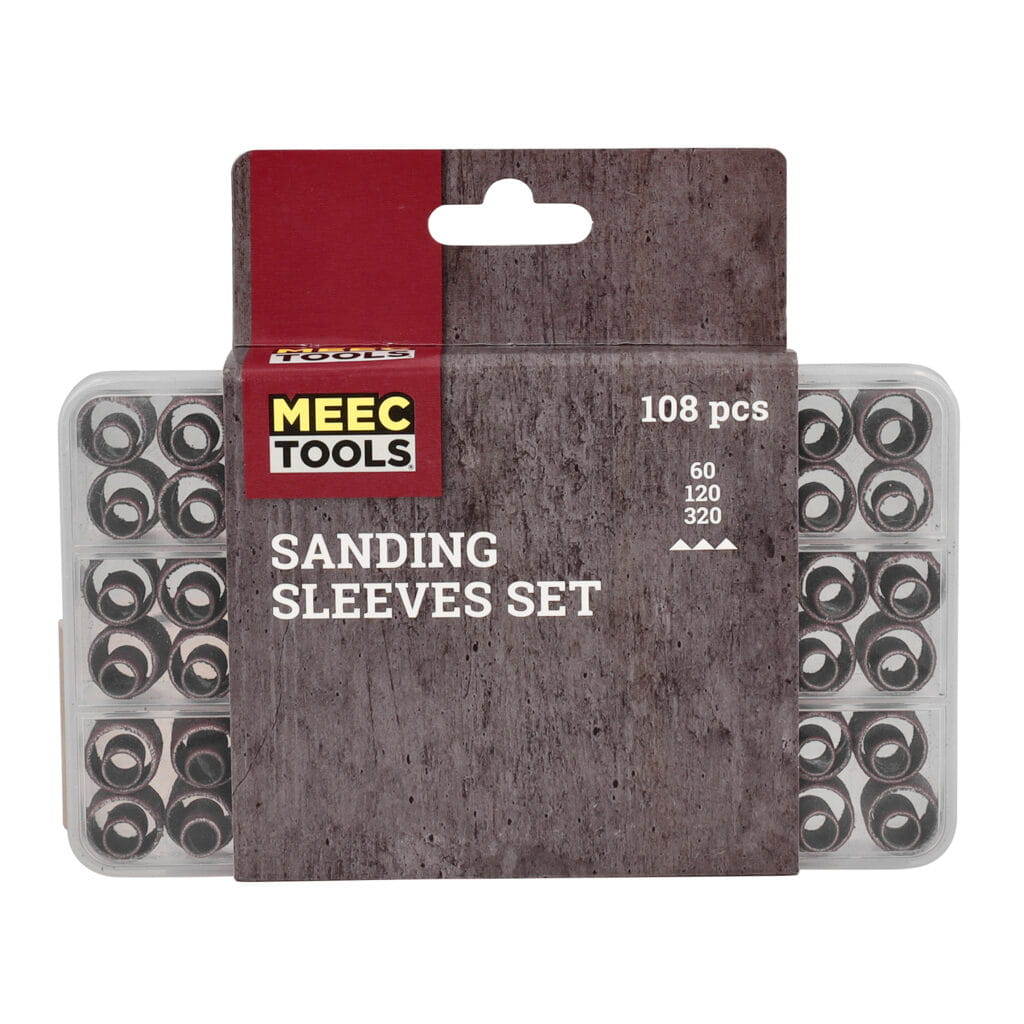 Duży zestaw marki Meec Tools zawiera taśmy ścierne i nakładki szlifujące do wszelkiego rodzaju obróbki powierzchniowej – to idealny wybór do prac stolarskich. Zestaw służy do użytku ze szlifierko-grawerką, a trzpień nakładek ma rozmiar Ø3,2 mm.