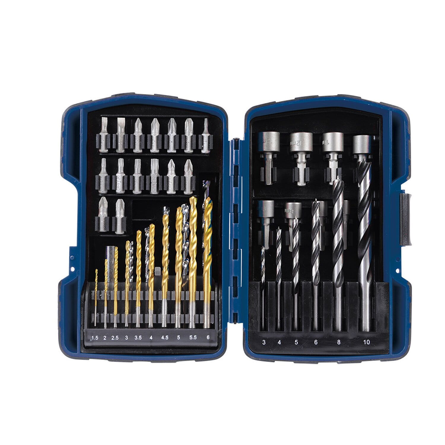 W zestawie znajduje się: 6 wierteł do drewna, 5 do betonu, 10 do metalu, 15 bitów o długości 25 mm, 60 mm namagnesowana przedłużka oraz 9 nasadek.