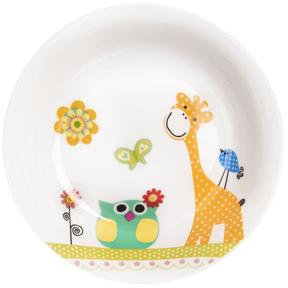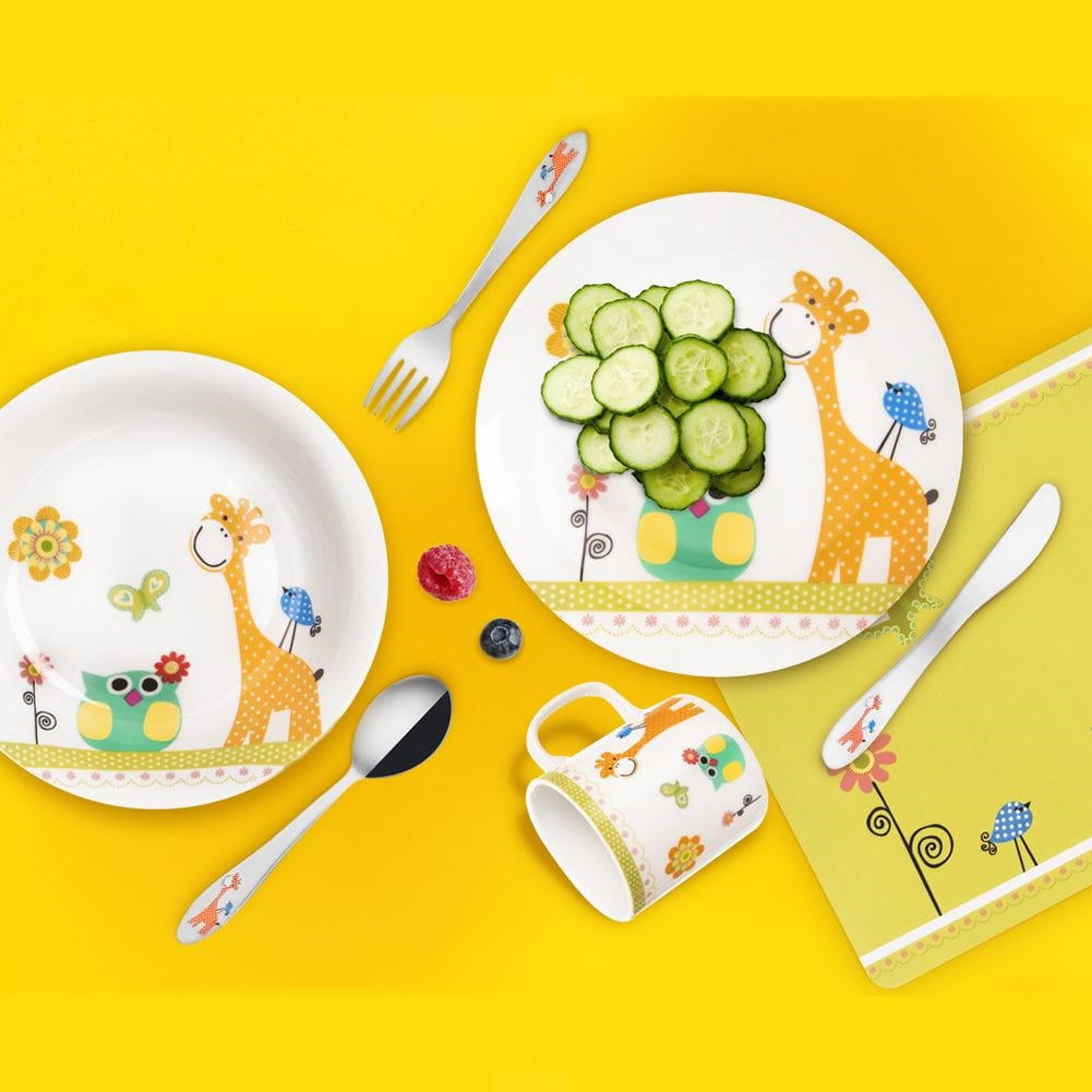 Zestaw śniadaniowy dla dziecka z dziecięcym motywem. W skład zestawu wchodzi talerz płaski, miseczka oraz kubek. Nadaje się do mycia w zmywarce do naczyń.✅Dane techniczne: