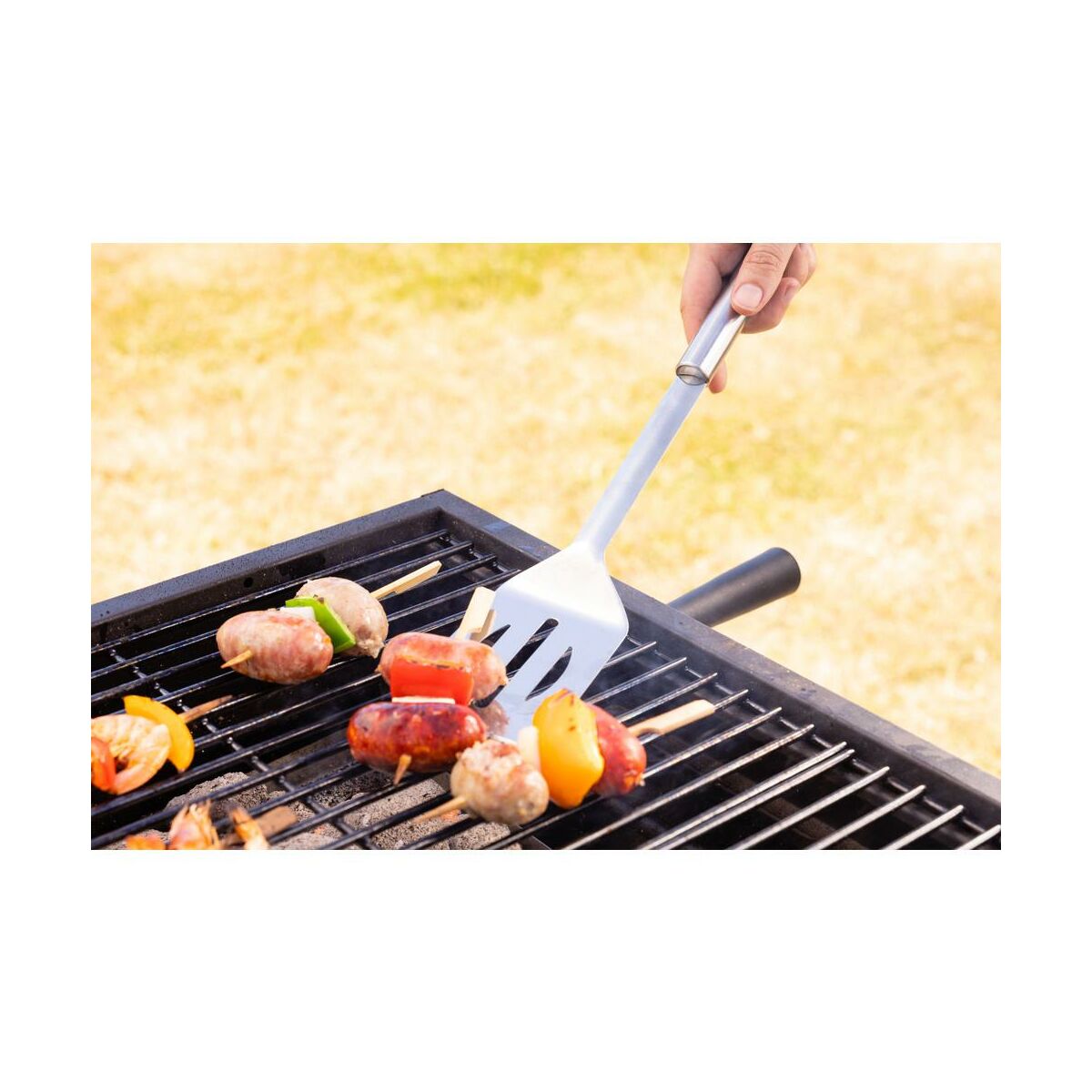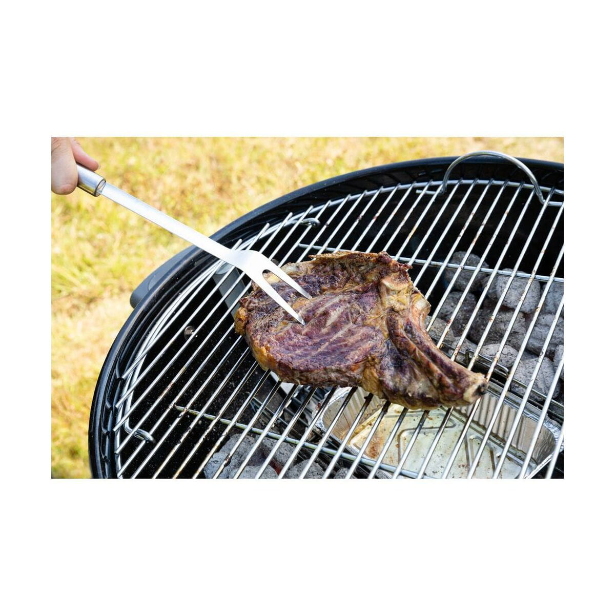 Zestaw sztućców do grilla wykonany ze stali nierdzewnej będzie pomocny podczas każdej uczty na świeżym powietrzu. W skład zestawu wchodzi: łopatka, szczypce oraz szczotka ze skrobakiem. Każdy element ma długość ok. 35 cm, co zapewnia bezpieczne operowanie przyborem, bez ryzyka oparzenia. Łopatka służy do przewracania burgerów oraz warzyw. Szczypce to najbardziej uniwersalne ze sztućców grillowych, będą pomocne przy obracaniu kawałków mięsa, kiełbasek oraz szaszłyków. Szczypce idealnie sprawdzą się do zdejmowania gotowych potraw z rusztu. Szczotka ze skrobakiem pozwoli wyczyścić ruszt po skończonym grillowaniu.