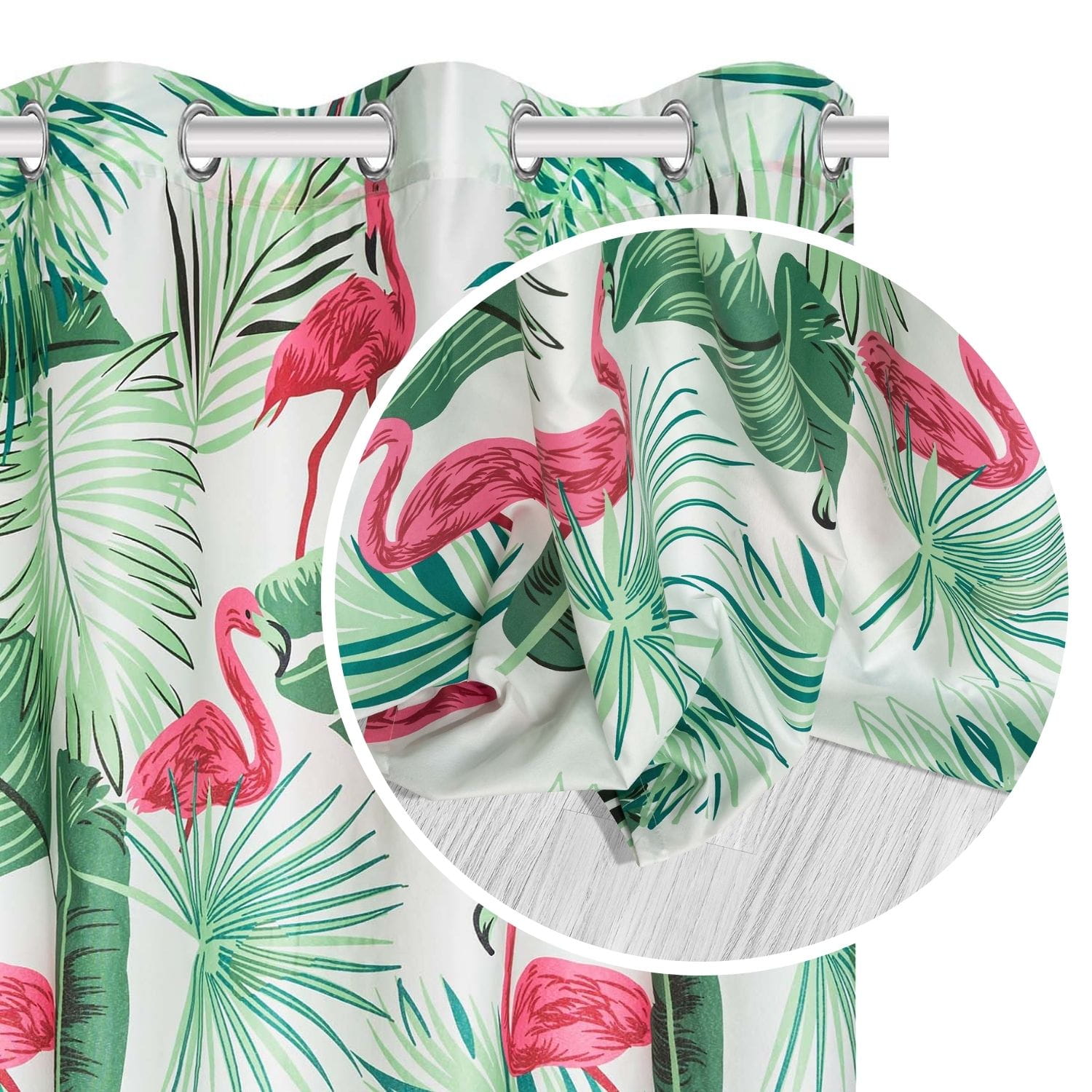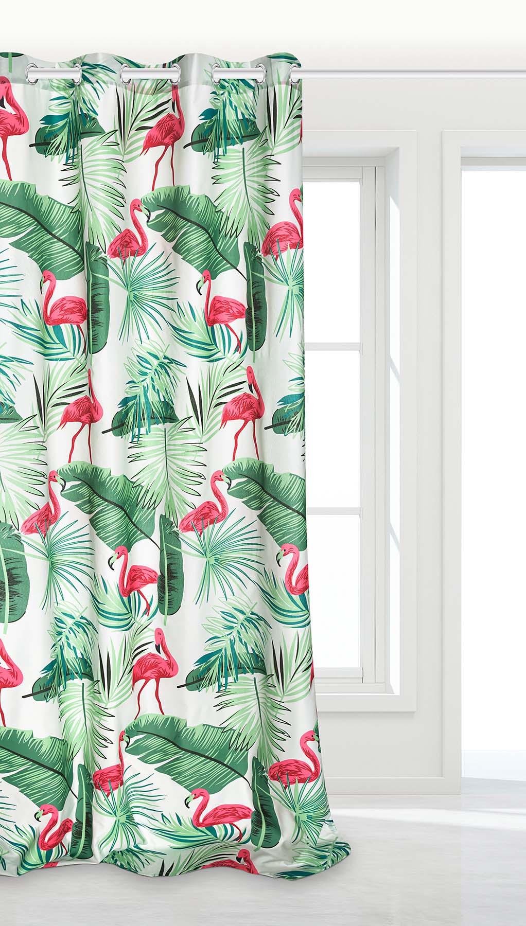 Zasłona zielona doskonale wpasuje się do wnętrz w nowoczesnym stylu. Inspirowana jest modnym wzorem we flamingi. Mocowana jest na 8 chromowanych przelotkach o średnicy 4 cm, które są bardzo proste w zawieszeniu na karnisz.