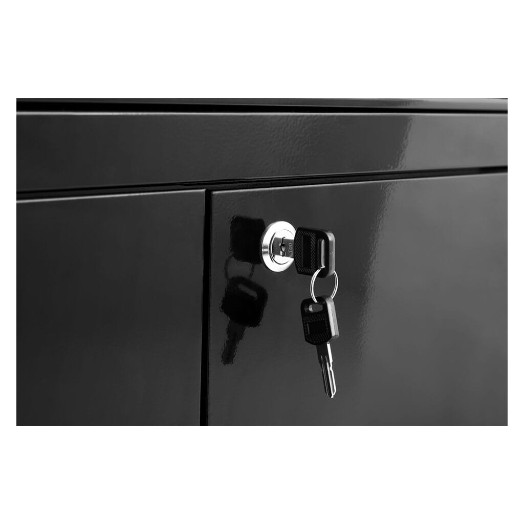 Wszystkie części są wykonane z blachy lakierowanej proszkowo o błyszczącym wykończeniu (jeśli nie podano inaczej). Szafki i szuflady są zamykane na klucz. W zestawie 10 kluczy.